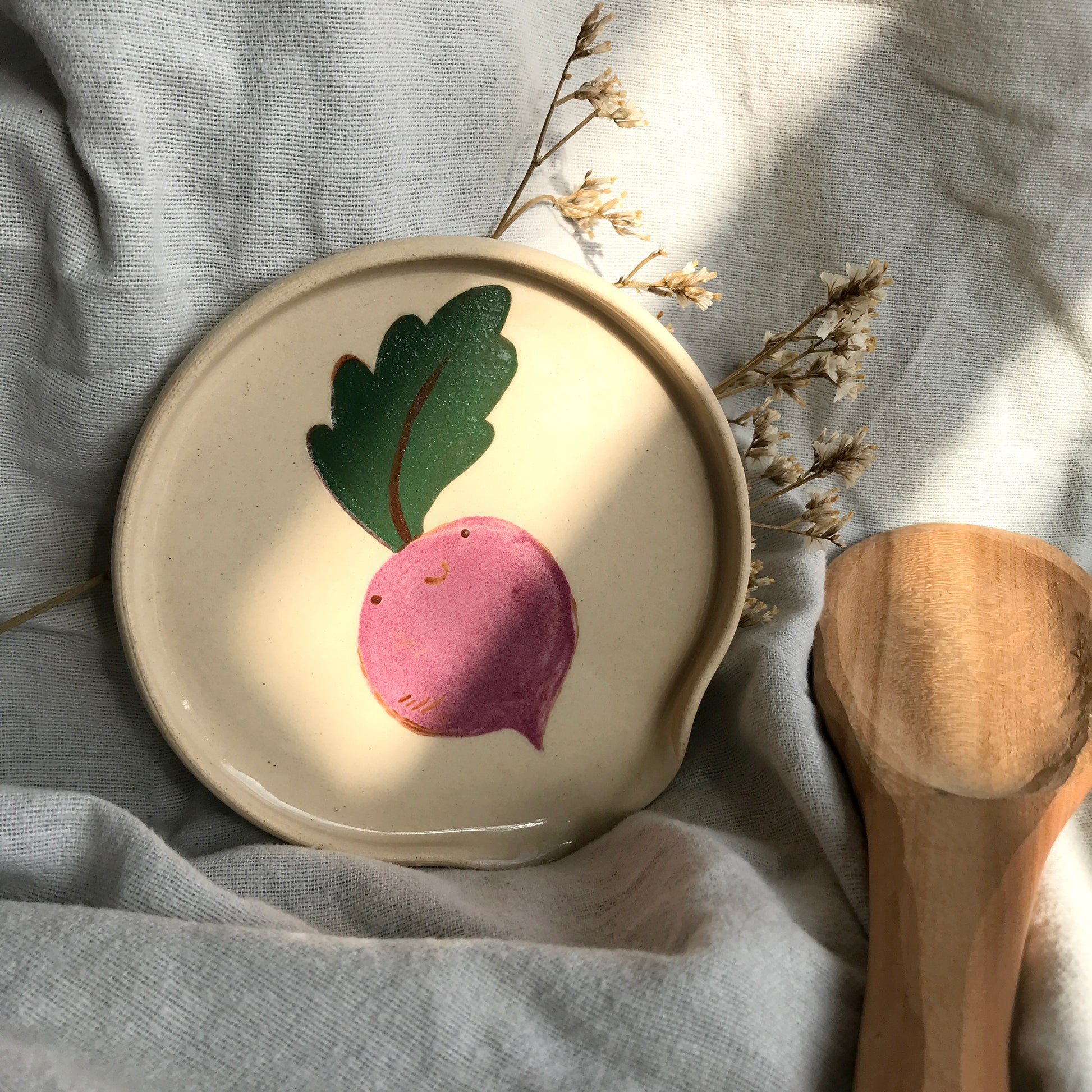 Hand Made and painted spoon rest with hand painted happy beetroot. Super bright underglaze colours perfect to add a pop of colour to your kitchen counter.