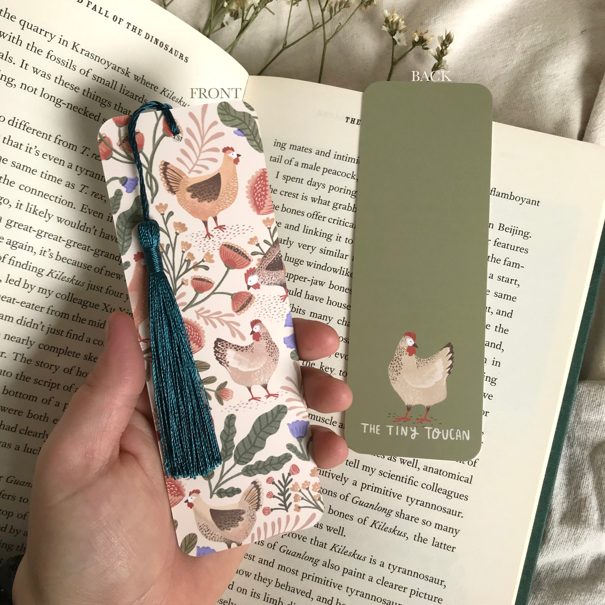Illustrated spring Chicken and florals bookmark featuring plenty of wintery plants and snow creatures. Available with or without a silky soft tassel.