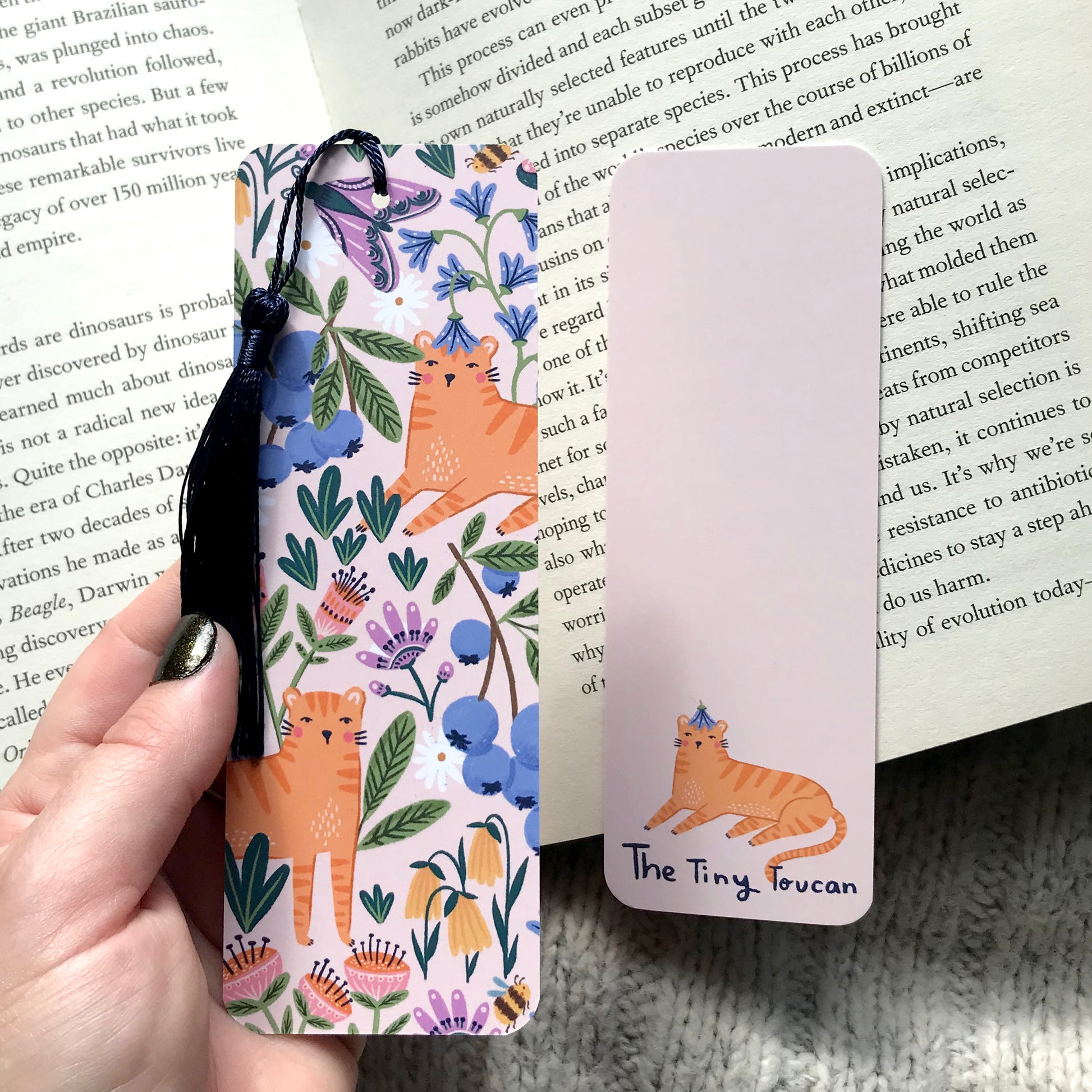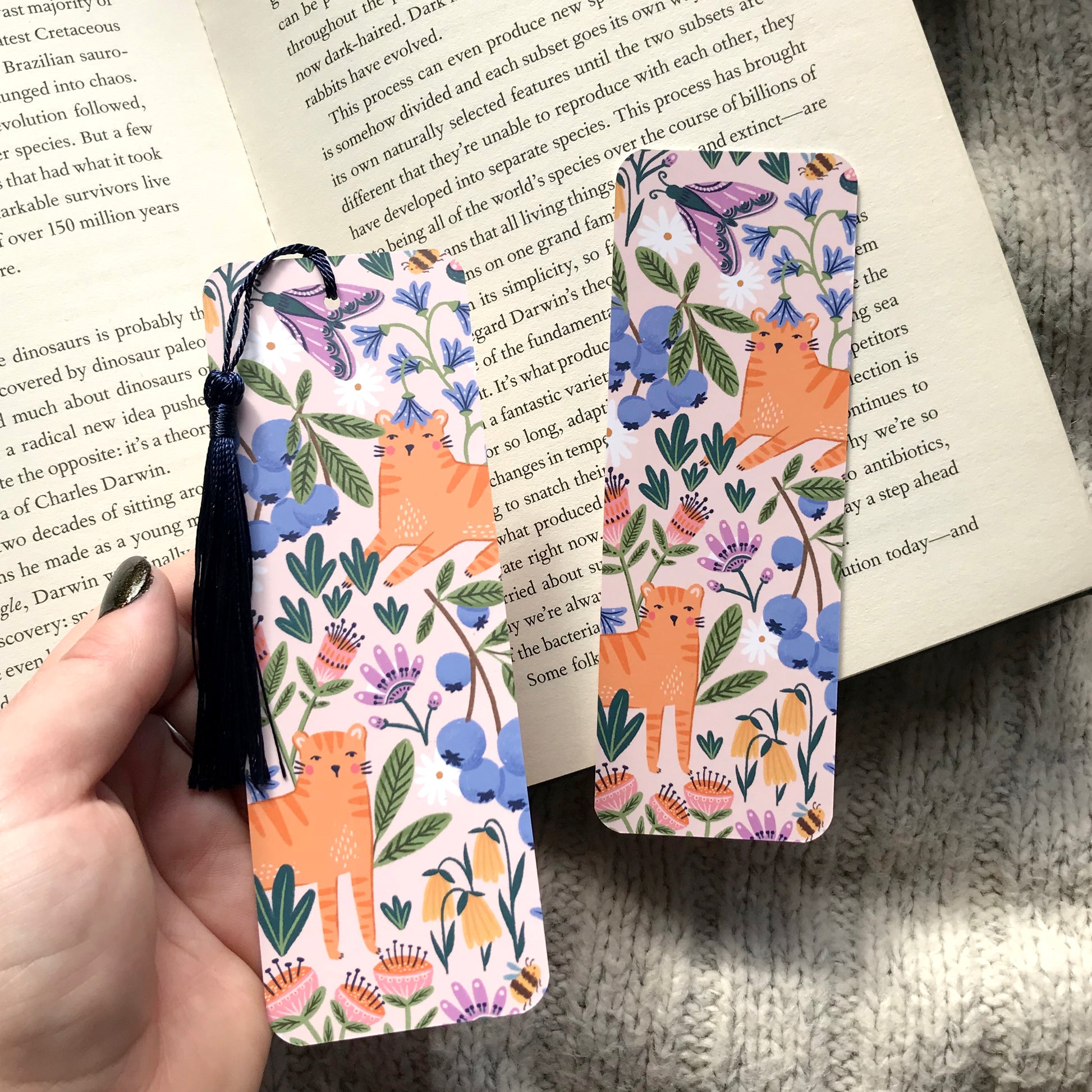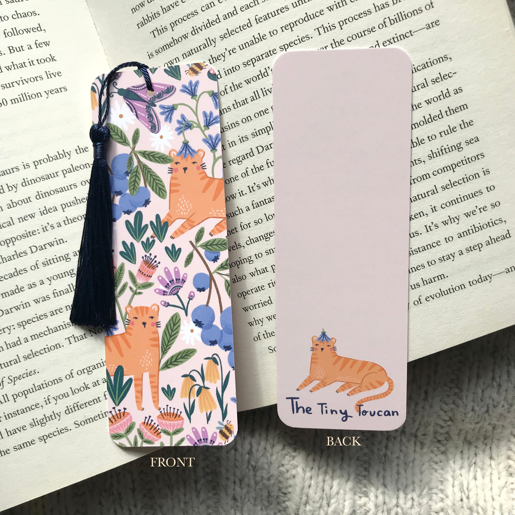 Illustrated colourful spring tigers, blueberries, butterflies and flowers bookmark available with or without a silky soft tassel.