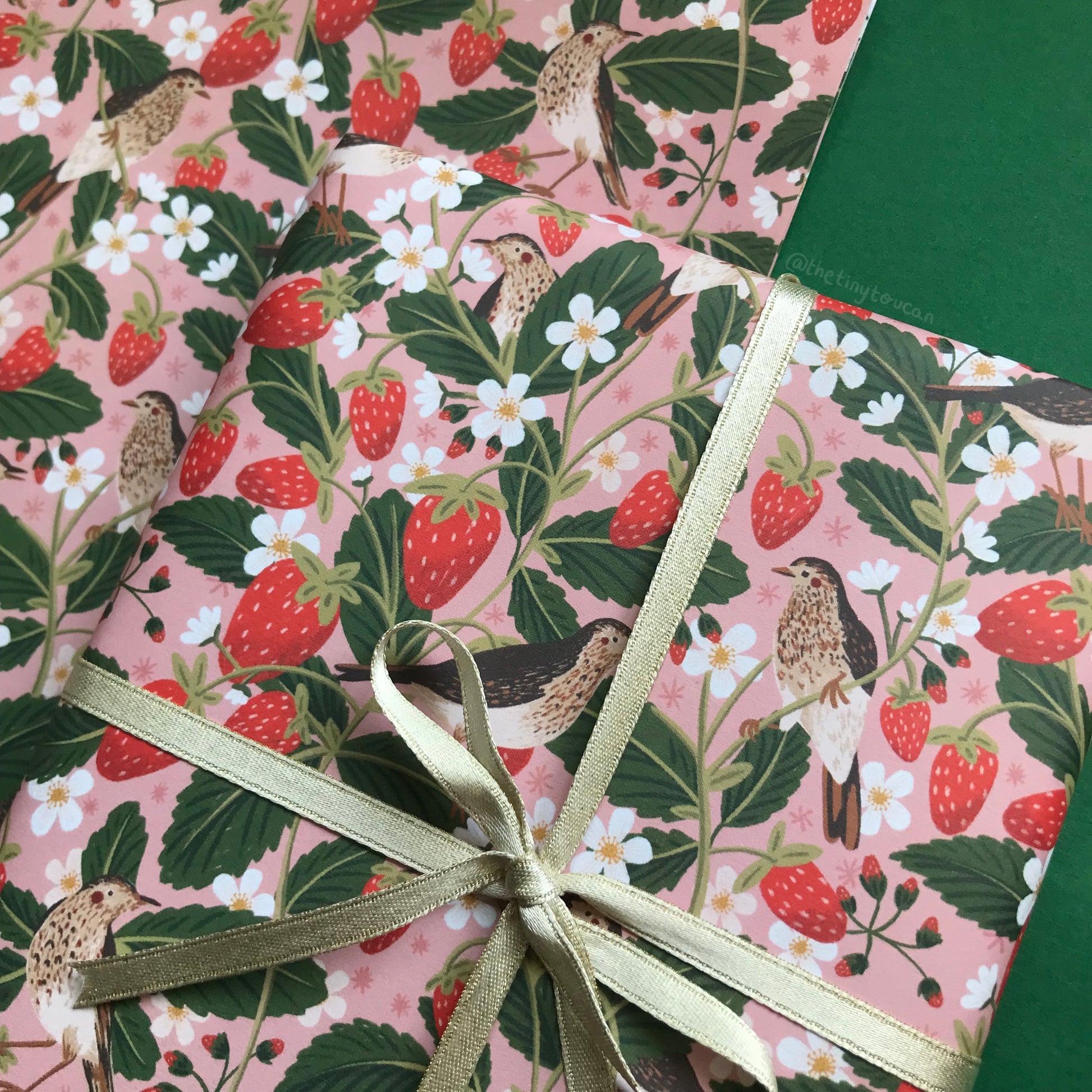 Illustrated British thrush birds among the strawberry patch wrapping paper.