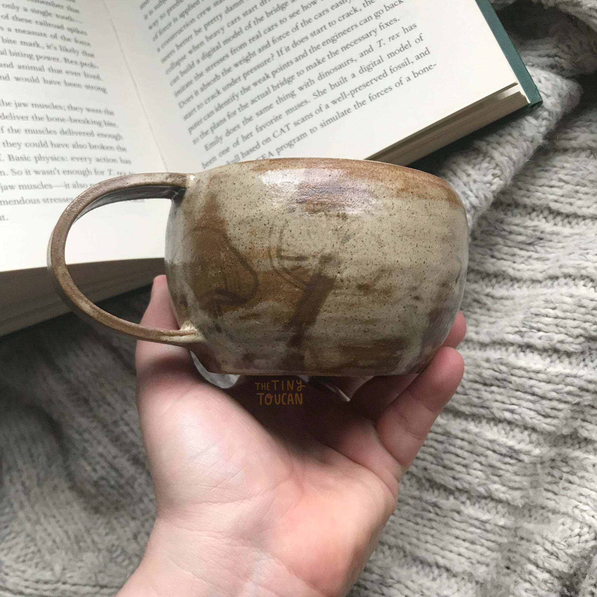 Stoneware with painted illustrative mushrooms and a swamp like speckled toasty brown glaze, perfect for any hot drink.
