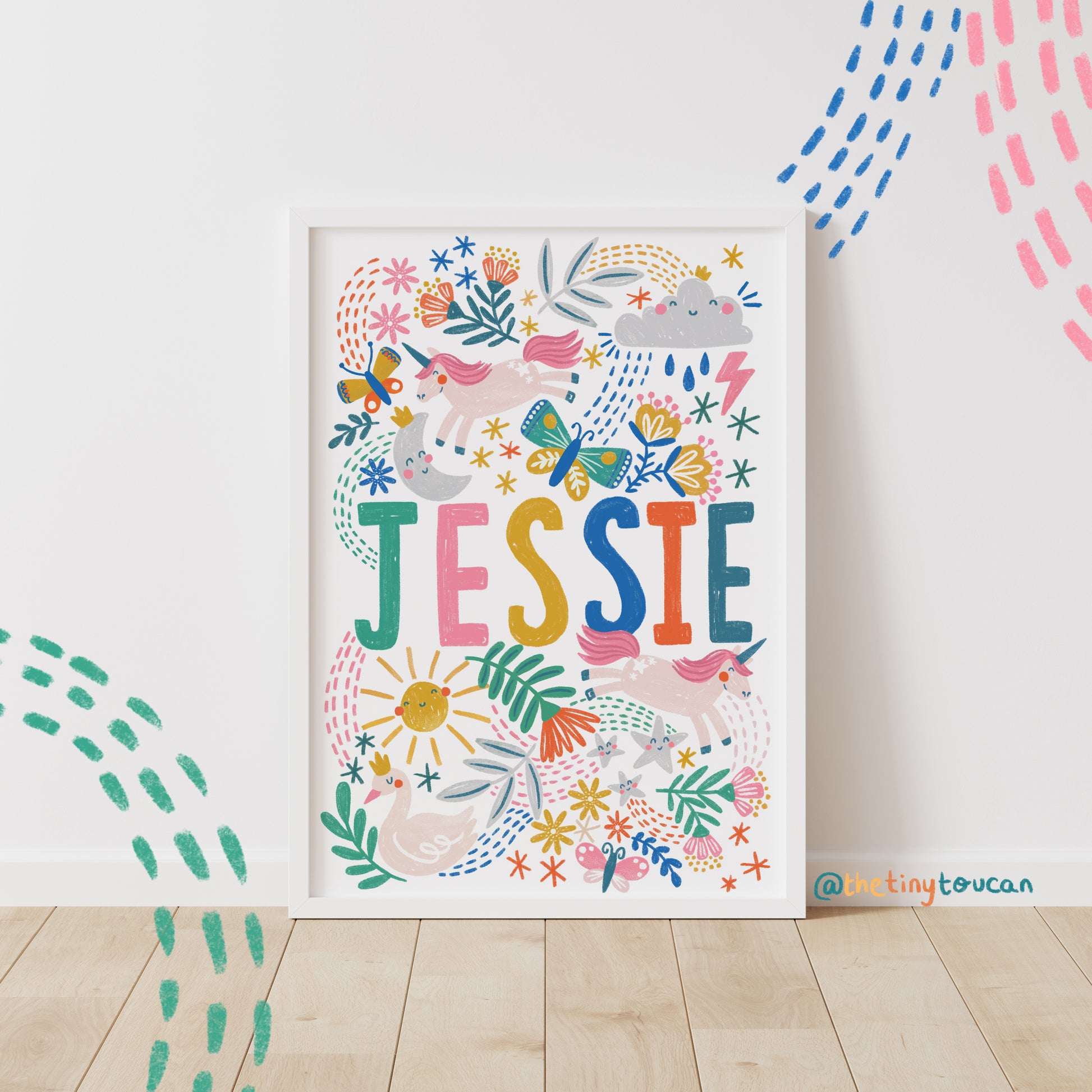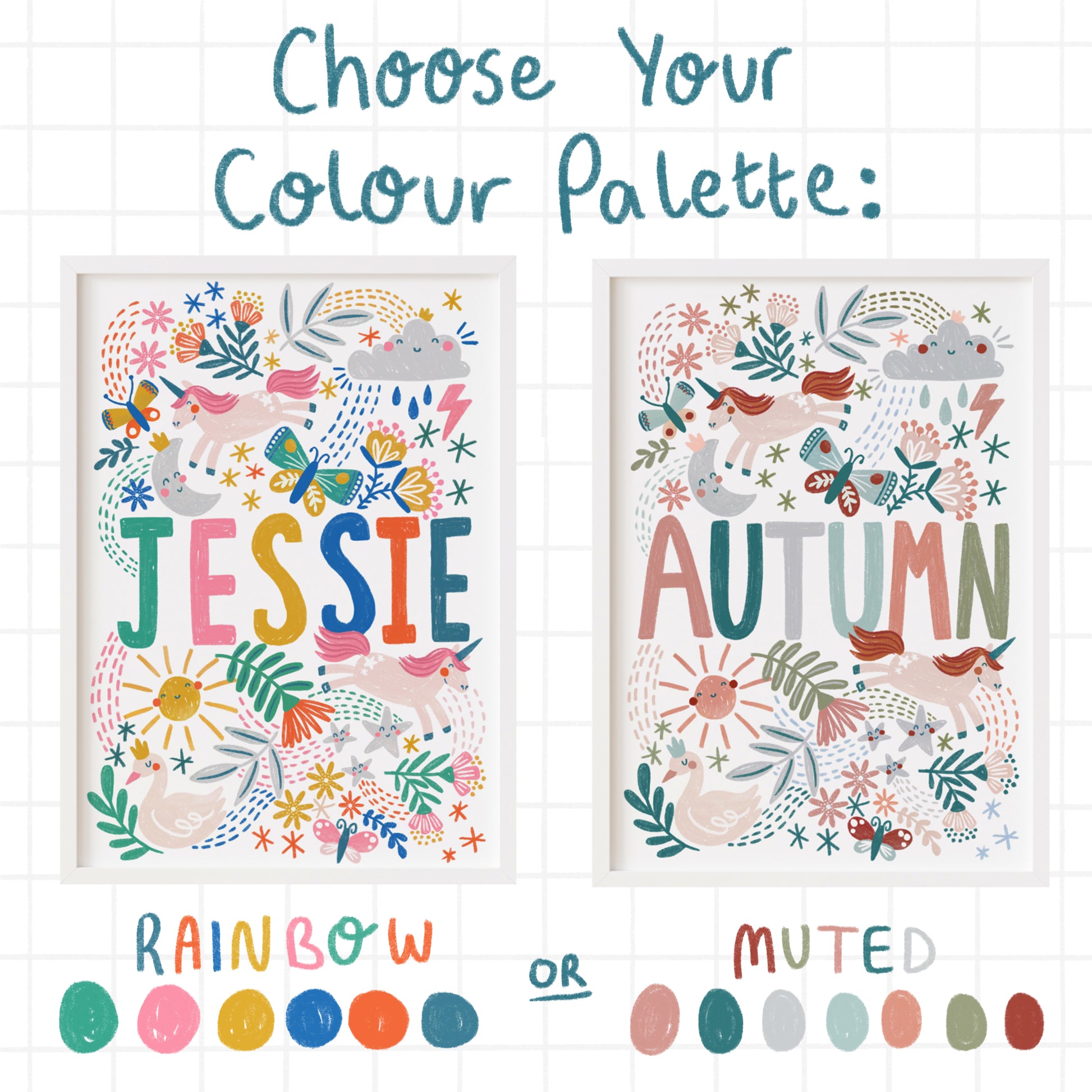 Custom Unicorns and rainbows name art perfect for children's bedroom, nursery or playroom. A fun and colourful decor option to brighten up your Childs wall.