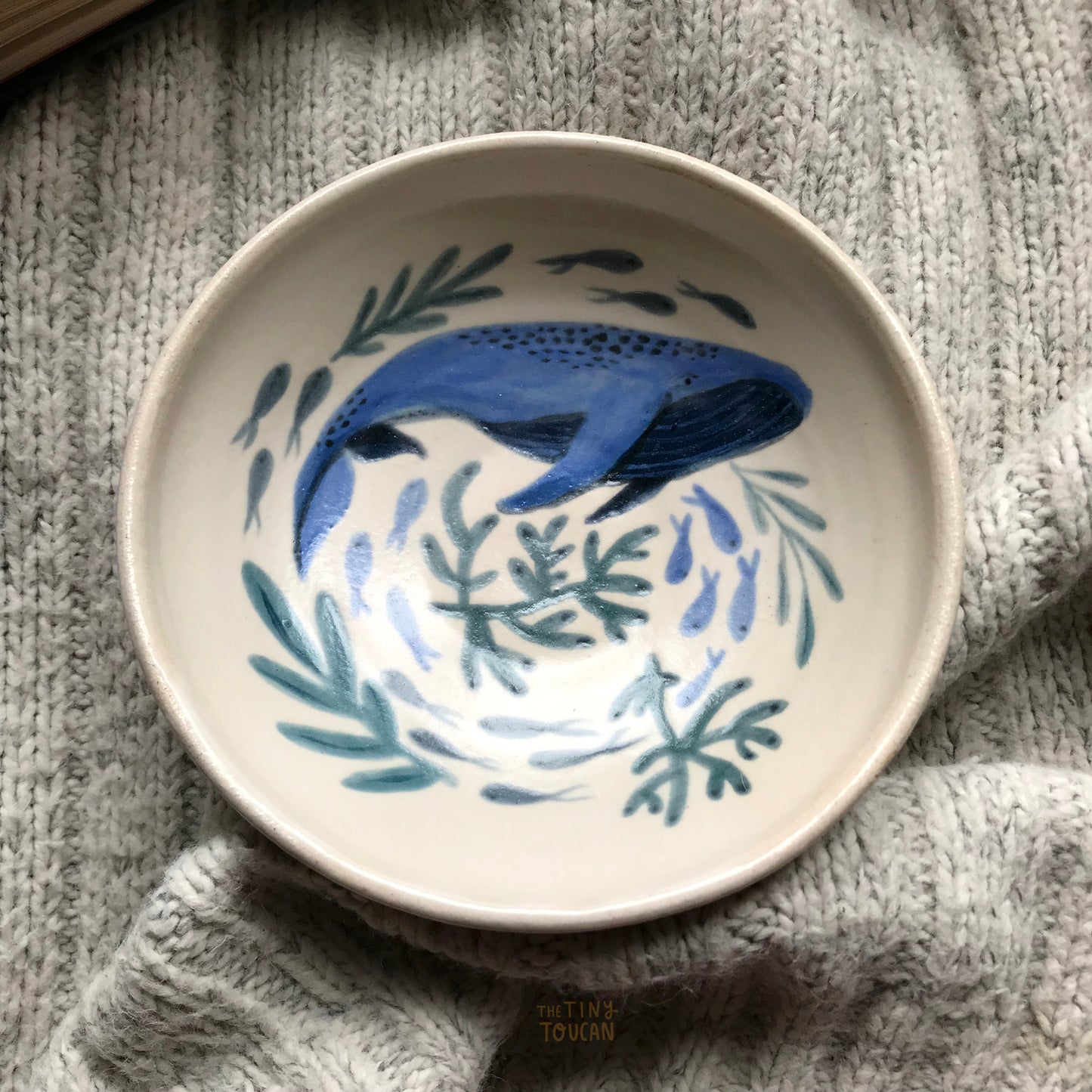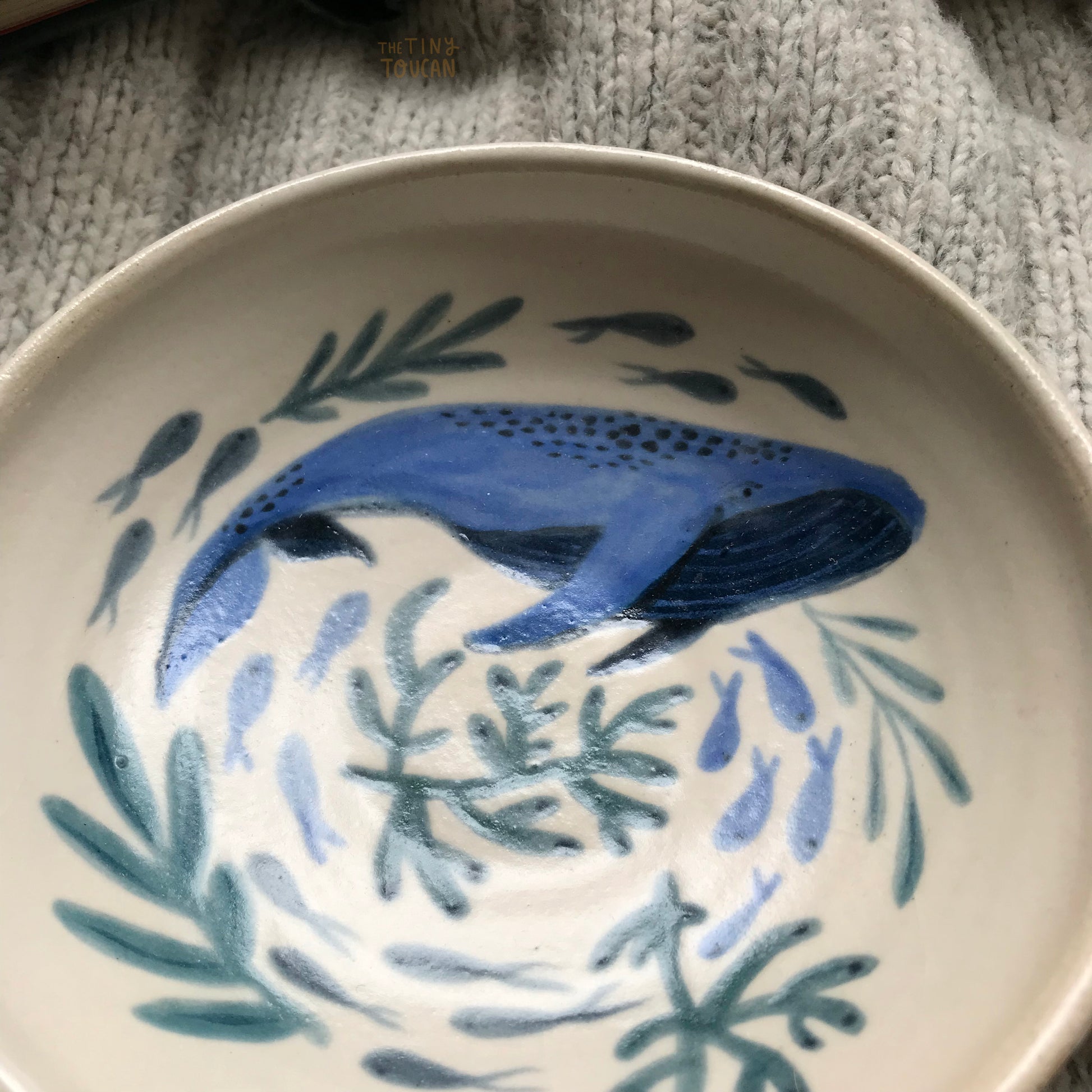Stoneware bowl illustrated with whales, corals and little fishies design.