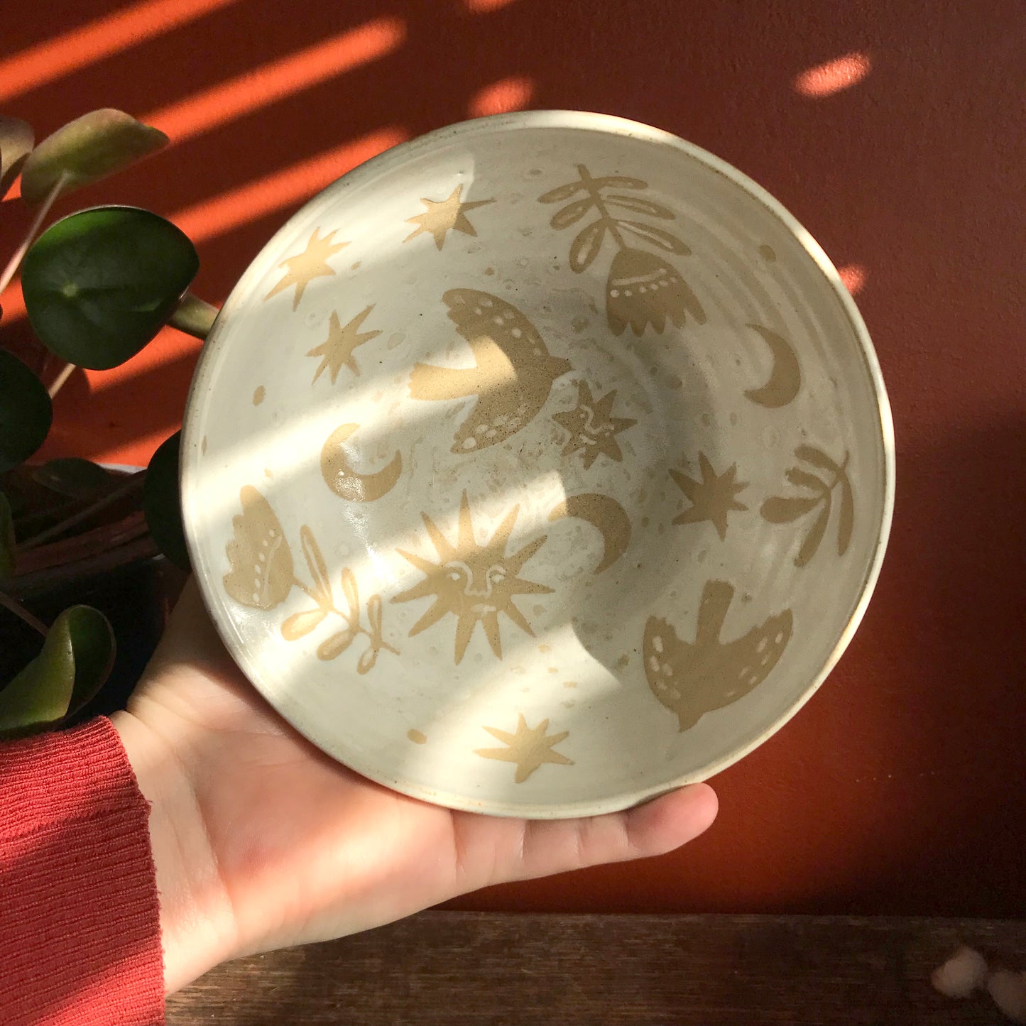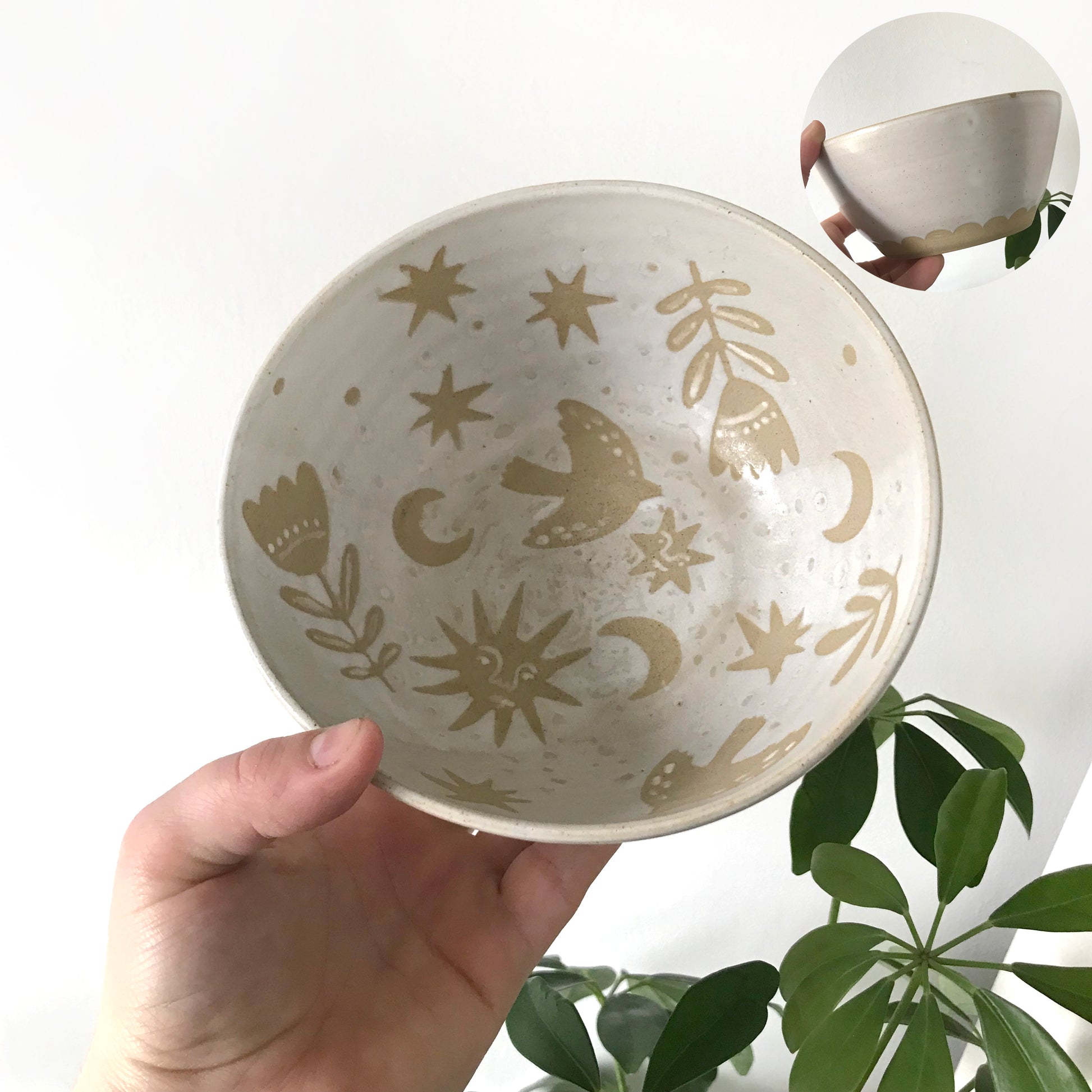 Stoneware bowl illustrated with folk floral design and a scallop edge detail.