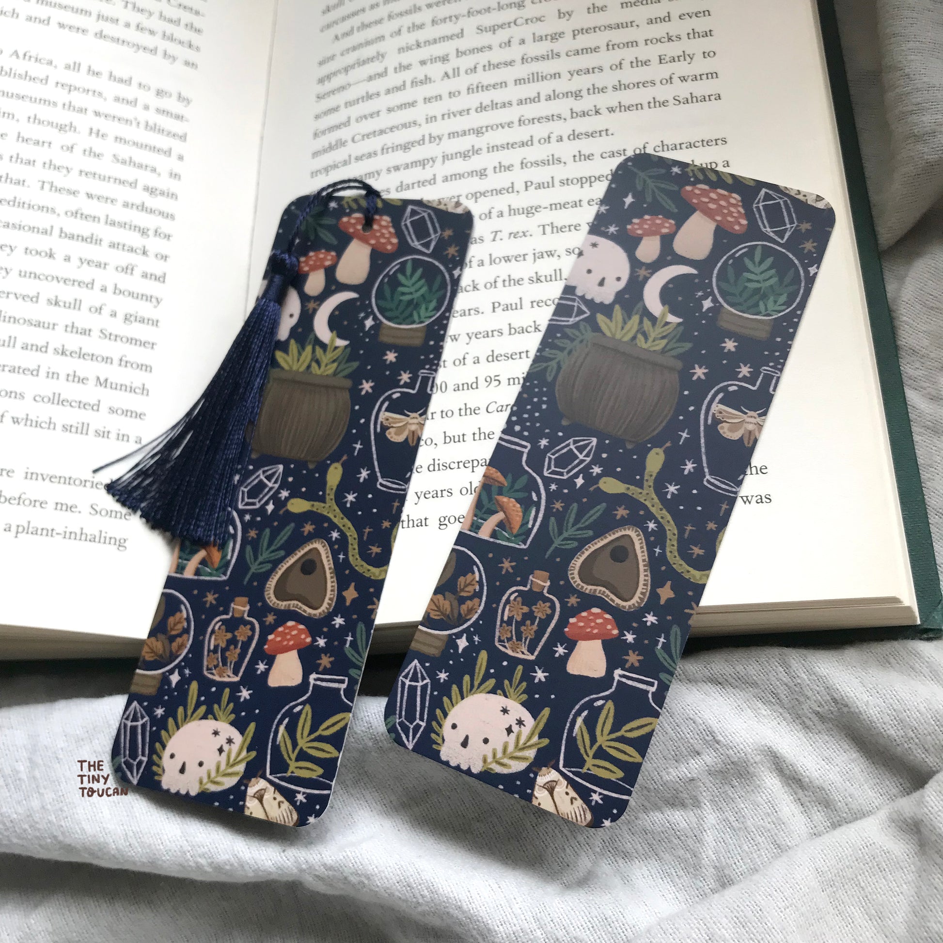 Illustrated witches brew bookmark featuring a cauldron, two headed snake, skulls, mushrooms, crystal balls, and all sorts of magical ingredients. Available with or without a silky soft tassel.