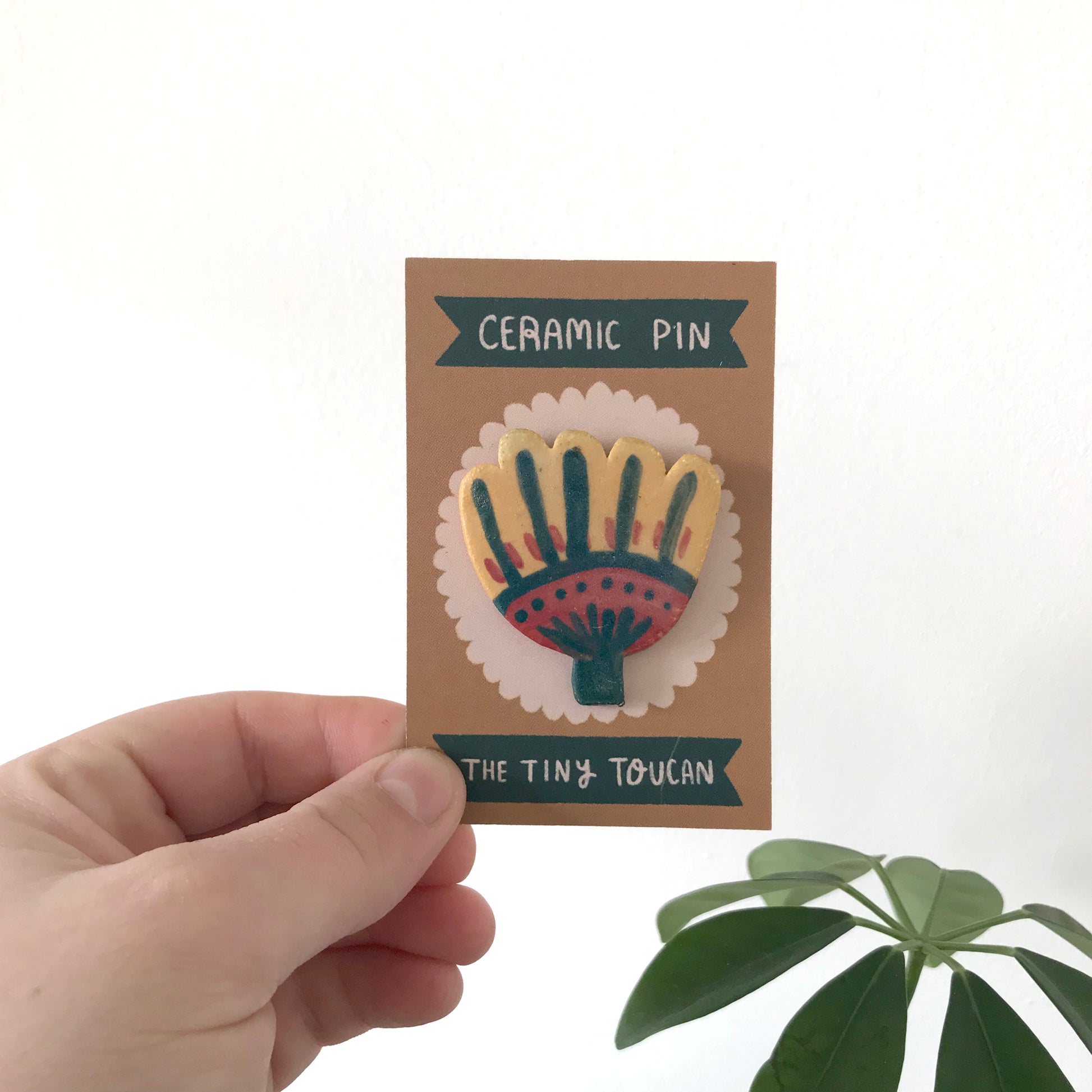Handmade Stoneware ceramic illustrated folk flower pin with brass butterfly clasp.
